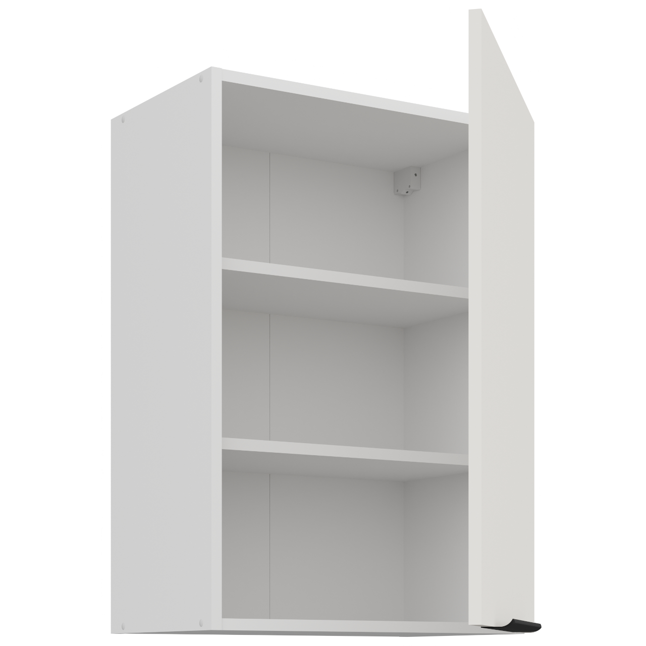 Cabinet interior in white colour. The cabinet is equipped with two shelves. Handle holes are drilled as blind holes (not through). |