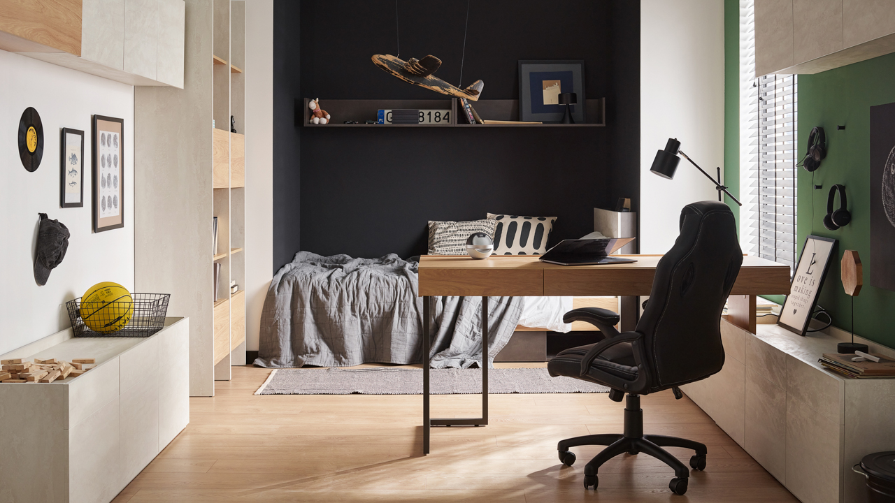 TF04 Desk 150 with 3 drawers right/left (150/76/61) TF05 Desk hutch 150 with orange lighting (150/19/22) TF08 3-door cabinet (150/52/42)